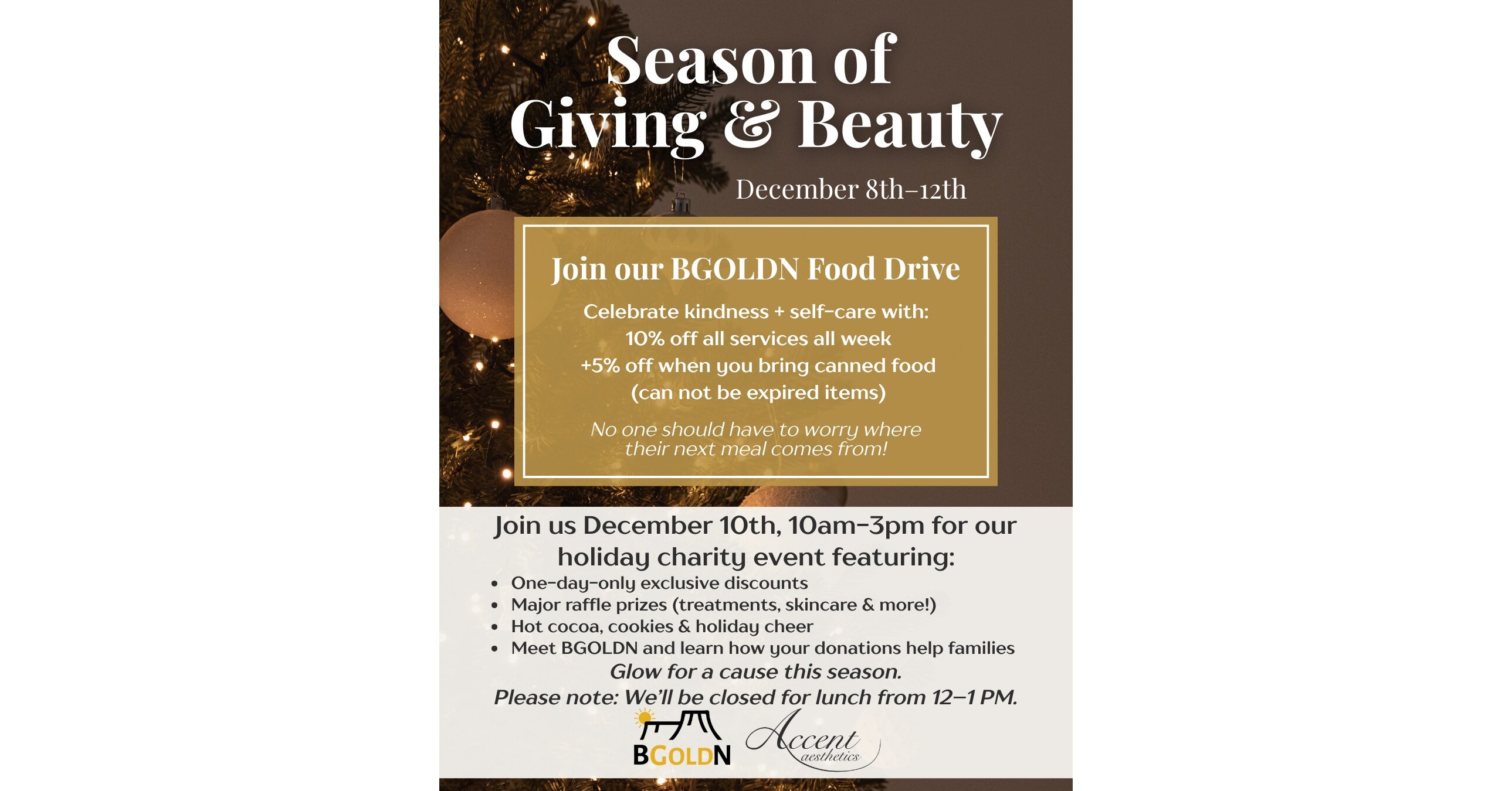 Ramie Pillette, Executive Director of Accent Aesthetics, highlighted the community focus of this year’s holiday season. “We are thrilled to announce our partnership with BGOLDN, an incredible organization dedicated to ensuring no child has to wonder where their next meal will come from,” said Pillette. “To encourage our loyal clients to give back this season, we are offering a special incentive. We hope you’ll join us at the event on the 10th!”