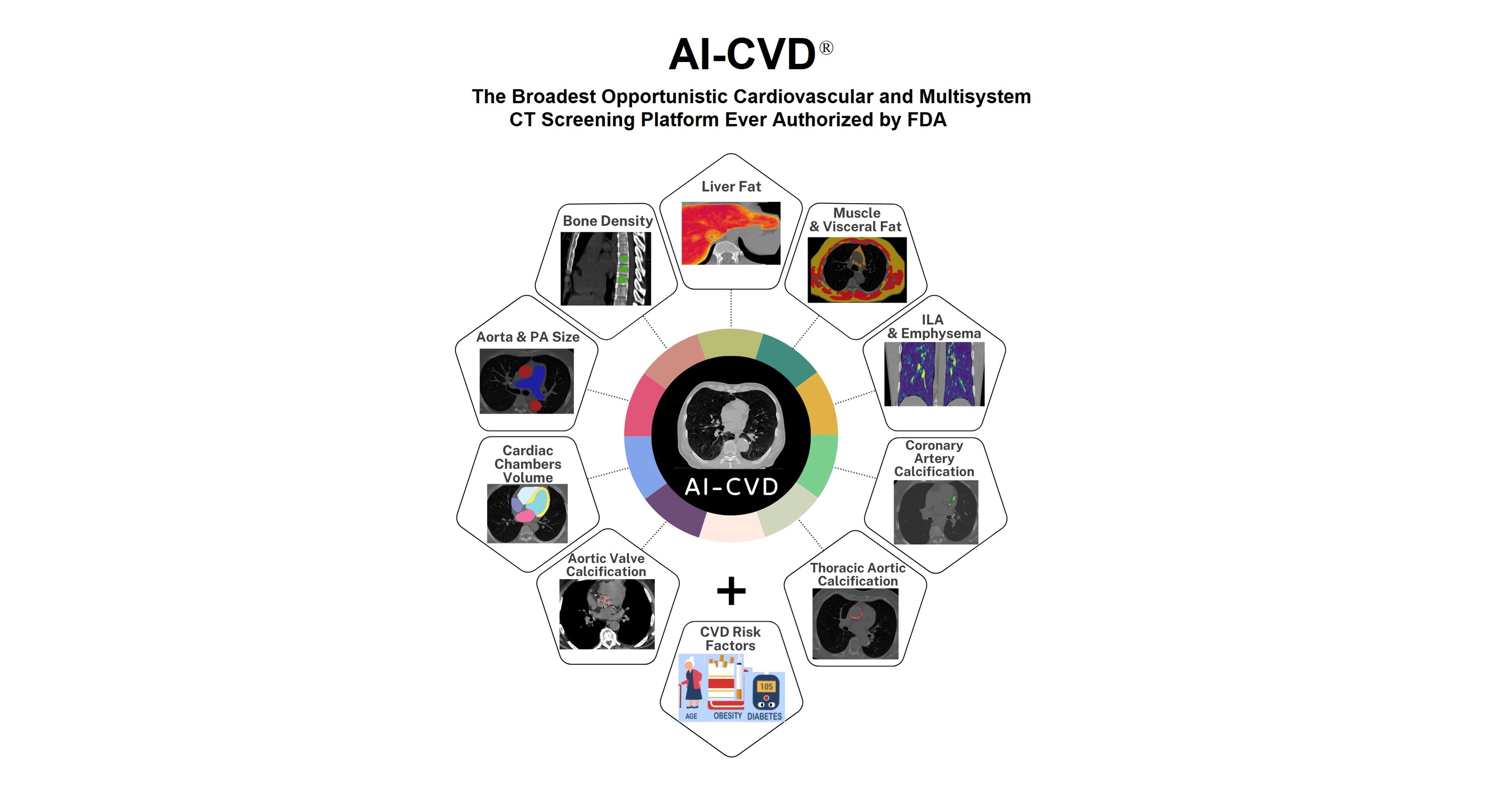 With this clearance, AI-CVD® becomes the most comprehensive FDA-cleared opportunistic screening platform available for CT imaging, enabling automated extraction of clinically relevant cardiovascular and systemic measurements from existing chest and abdominal CT scans—without additional imaging, radiation, contrast, or workflow disruption.